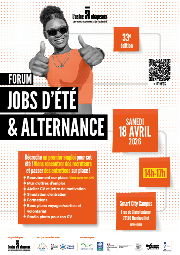 Le Bureau Info Jeunes de l’Usine à Chapeaux, en partenariat avec la Mission Locale Intercommunale de Rambouillet et France Travail, organise le Forum Jobs d’été & Alternance :
